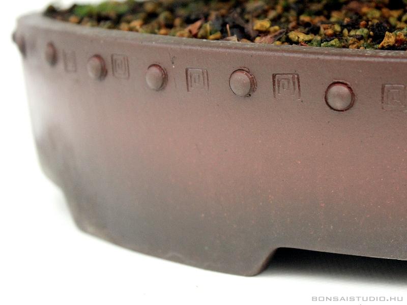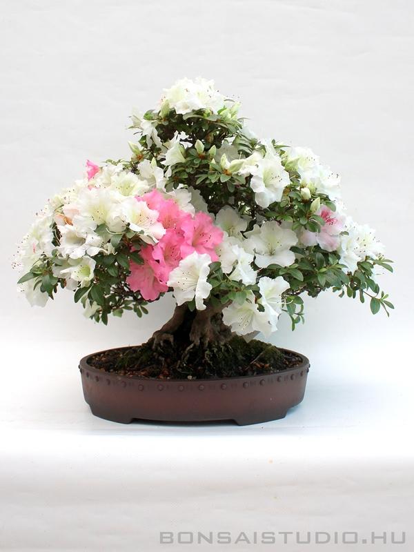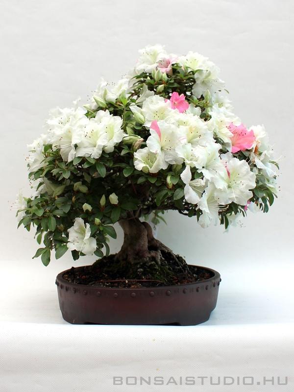 Kifu méretű (20 cm től-35 cm ig ), moyogi stílusú Kaho Rhododendron Indicum, érdekessége, hogy a gyökérnyakon shari található. Fagyálló, barna mázatlan bonsai-tálban.